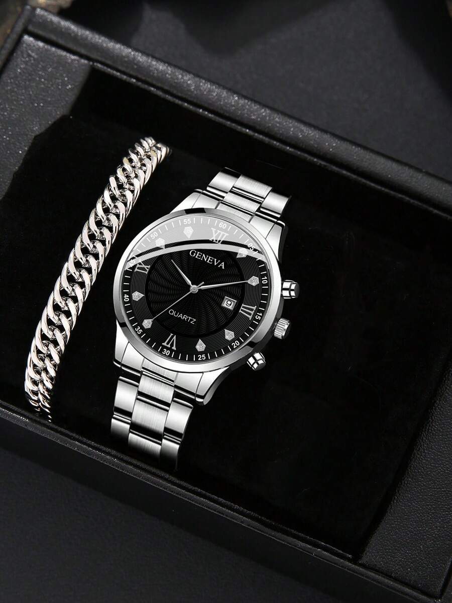 2pcs Men's Silver Watch Set: Casual Fashion Men's Watch With Black Dial And Diamond Decor + Cuban Link Bracelet - Valentine's Day, Birthday, Father's Day, Anniversary Gift, Suitable For Business And Daily Wear