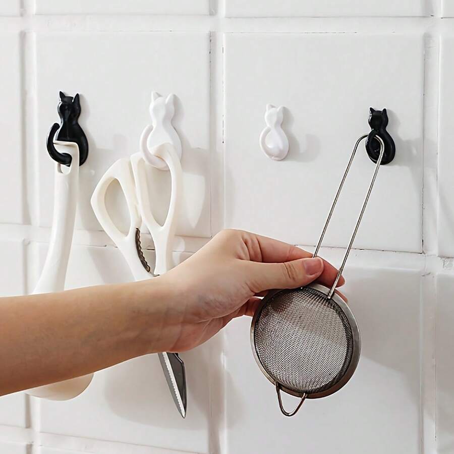 2pcs No Drill Cat Shaped Adhesive Hooks, Transparent Strong Sticky Wall Hangers, Creative Cartoon Kitchen/Bathroom Door Hook