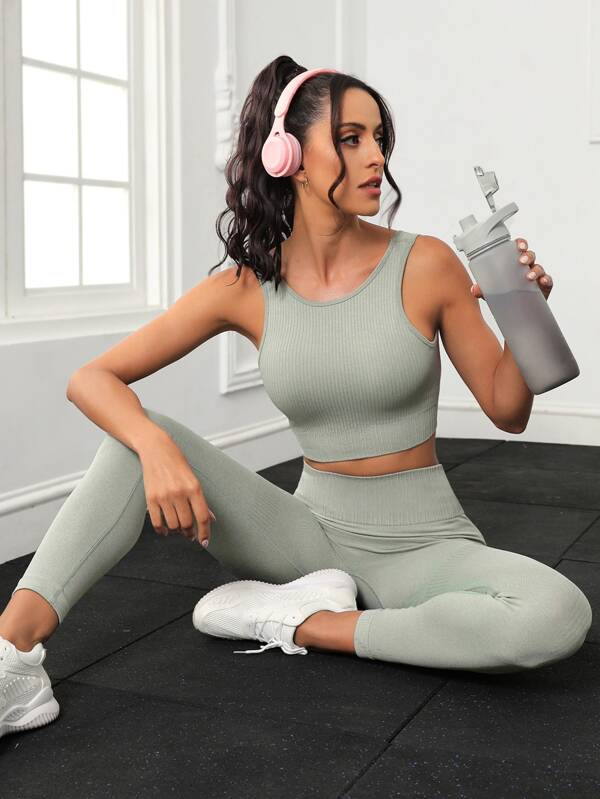 Yoga Basic 2pcs Ribbed Seamless High Stretch Yoga Set Gym Suit Tank Top & Scrunch Butt Leggings workout set