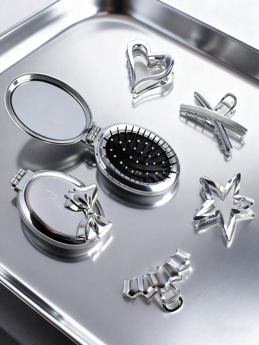 2pcs/Set Foldable Comb & Hair Clip Combo Set, Minimalist High-End Oval Air Cushion Comb With Electroplated Silver Design, Portable Foldable Comb, Cute Bow Hair Clip, Star/Wave/Heart Shaped Hair Clips, Ponytail Clips, Suitable For Students And Women, Great Gift ,Hair Styling Kit ,Hair Tool Kit