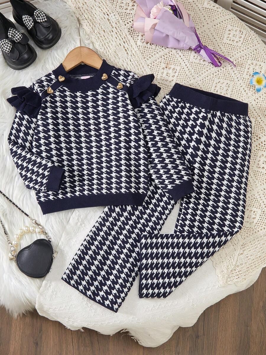 2pcs/Set Young Girls Plaid Knit Sweater And Wide Leg Pants Co-Ord Set, Fashionable Casual Outfit For Girls, Suitable For Everyday Wear, Home, And Outings, Autumn/Winter