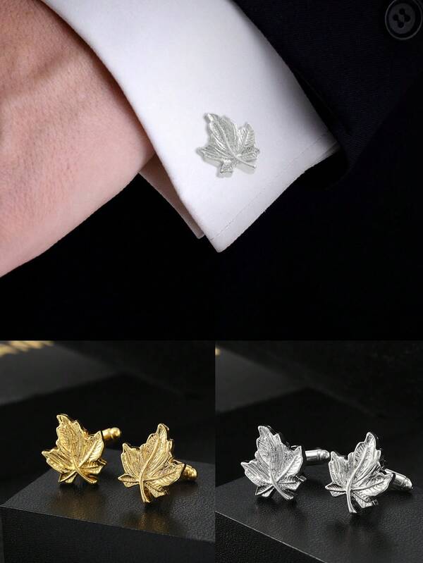 2pcs Silver-tone Exaggerated Maple Leaf Shaped French Cufflinks Set For Business Attire