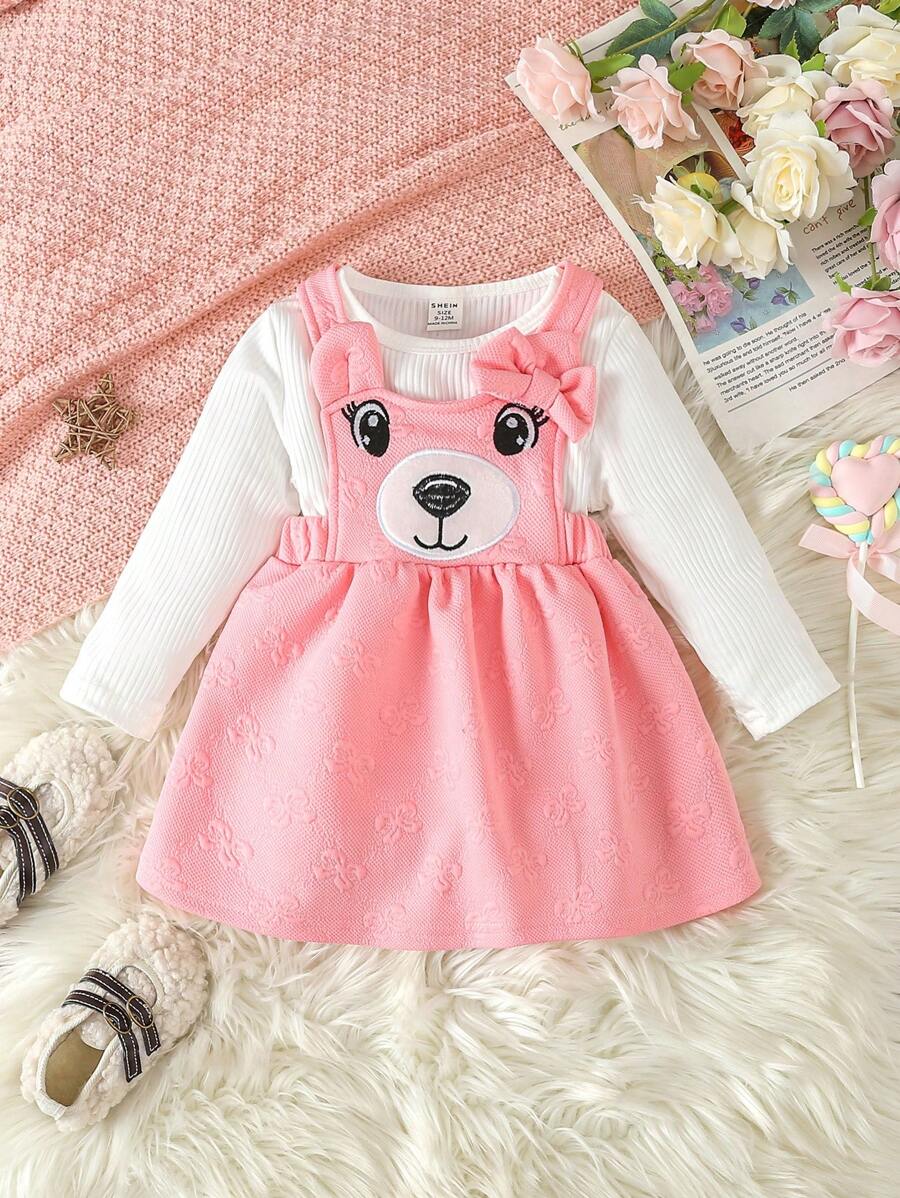 2pcs Toddler Girls' Casual Cartoon Embroidery Pink Dress Set