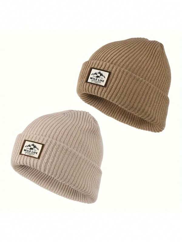 2pcs Unisex Beige And Khaki Ski Hat, Y2k Style Wild Lifeb Embroidery Knitted Hat, Outdoor Warmth, Casual Winter Hat For Daily Commute