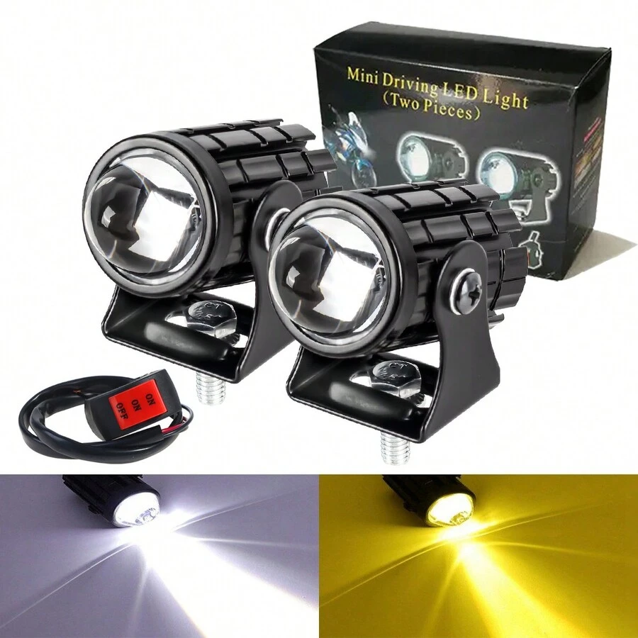 2pcs White + Yellow Motorcycle LED Headlight Mini Driving Light Fog Lamps 12V 24V Universal Dual Color Projector Lens with Switch For ATV Scooter Auxiliary Spotlight Lamp Motorbike Accessories