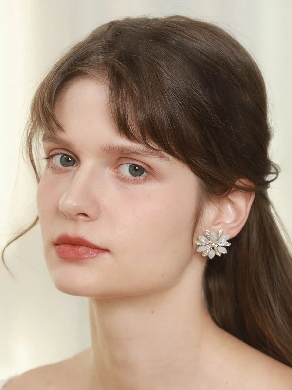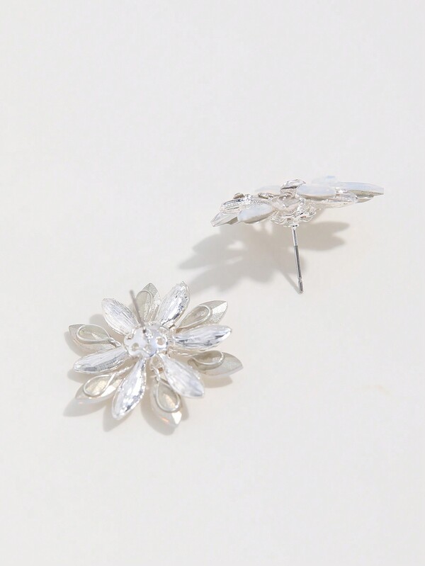 2pcs Women'S Silver Sunflower Shaped Alloy & Rhinestone Decor Stud Earrings, For Wedding