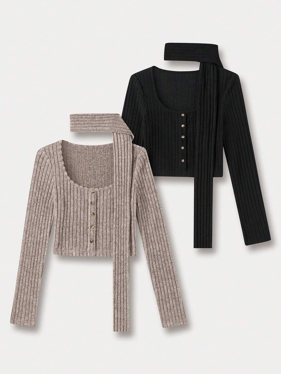 2pcs Women's Long Sleeve T-shirt With Large Round Neck And Scarf
