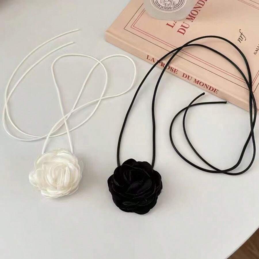 2pcs Women's White And Black Rose Pattern Fabric Choker Necklace, Perfect For Daily Wear