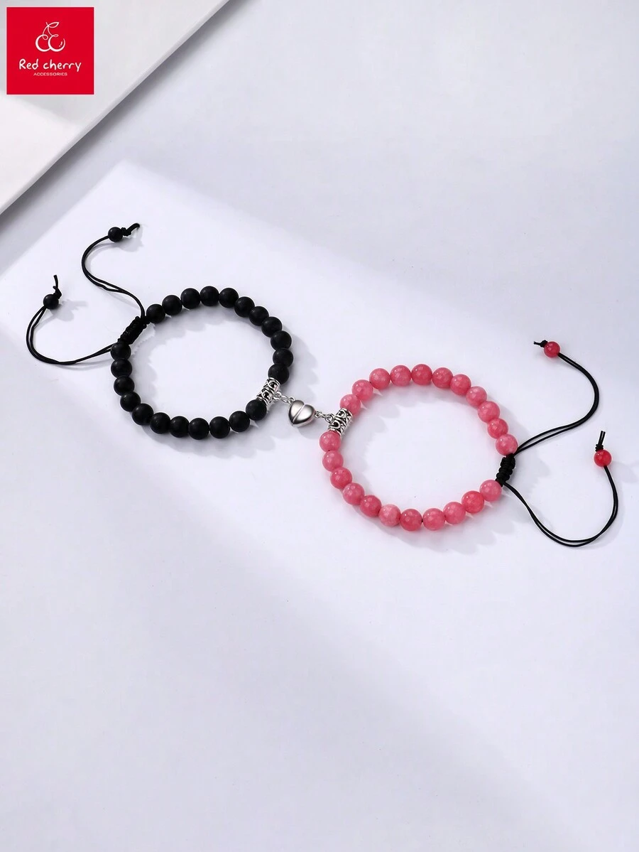 2pcs/ Set Magnet Bracelets For Girl'S Romantic Heart Matching Natural Stone Beads Yoga Bracelet Everyday Life Gift Jewelry