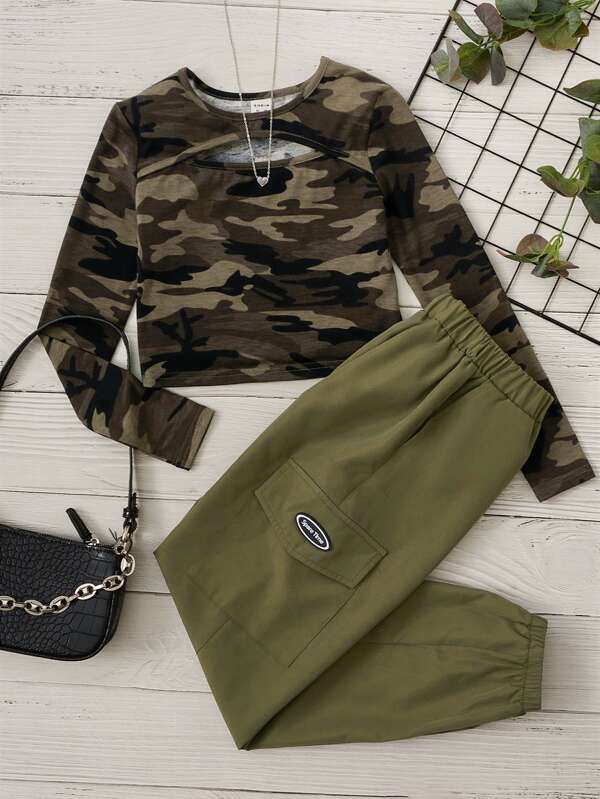 SHEIN Kids EVRYDAY Tween Girl 2pcs/Set Casual Camo Printed T-Shirt And Cargo Pants
