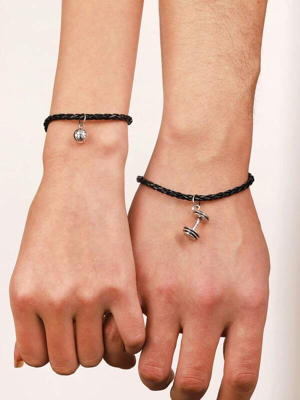 2pcs/Set Couple Black Rope Bracelet With Pendant, Valentine'S Day Holiday Gift, Suitable For Men And Women Wear