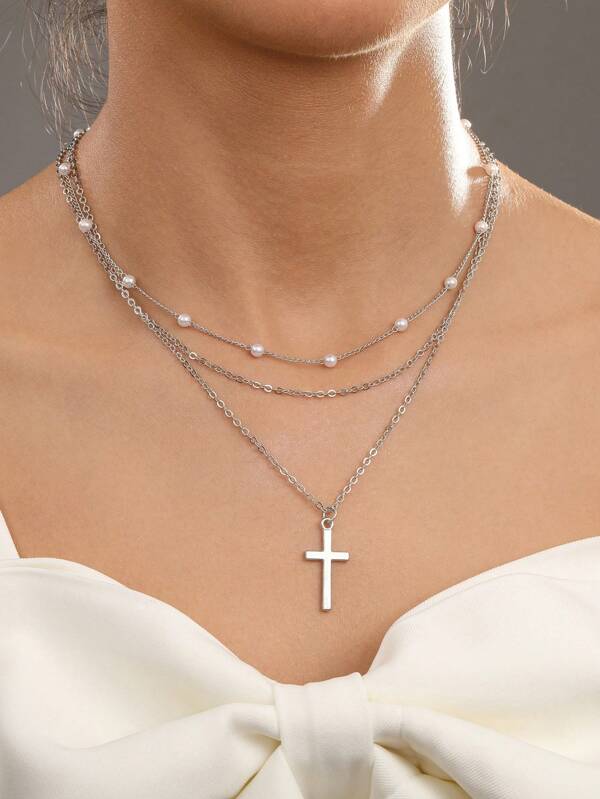 2pcs/Set Creative Multilayer Imitation Pearl Choker Necklace With Cross Pendant, Layering Jewelry