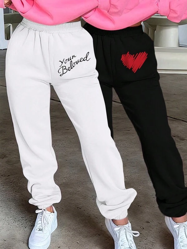 SHEIN Essnce 2pcs/Set Heart & Graffiti Patterned Elastic Waistband Long Pants With Fleece Lining, Suitable For Valentine's Day And Leisure Time
