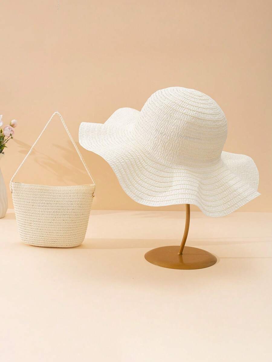 2pcs/Set Ladies' Milk White Fashionable Beach Straw Crossbody Bag And Sun Hat Combo, Perfect For Vacation & Beach Wear