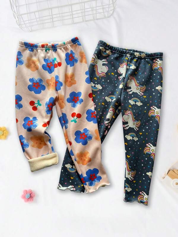2pcs/Set Little Girls' Fleece Lined Leggings With Scalloped Edge