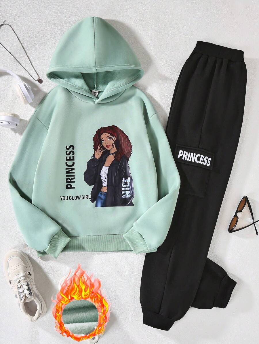 2pcs/Set Teenage Girls' Hooded Sweatshirt With Fleece Lining And Cargo Style Pants, Winter Outfits