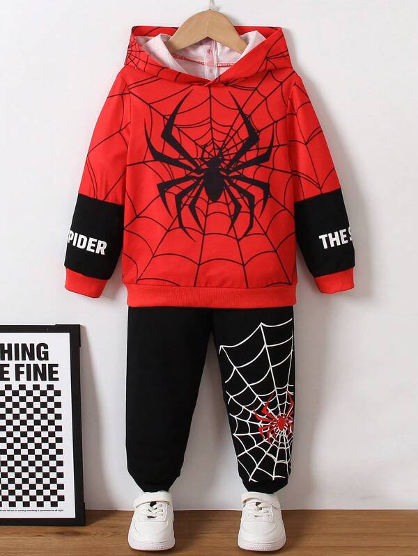 SHEIN Kids QTFun 2pcs/Set Trendy And Cute Spider Printed Casual Comfortable Sweatshirt Set For Toddler Boys, Spring And Autumn