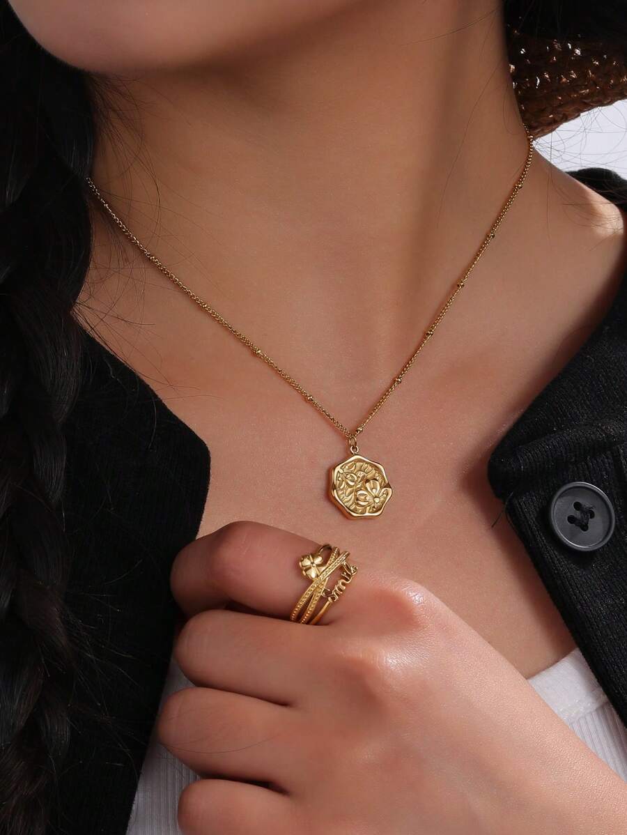 2pcs/Set Vintage Personalized Stainless Steel 18k Gold Plated Flower Decorated Open Ring And Necklace Set, Suitable For Women To Wear At Parties And Daily Life