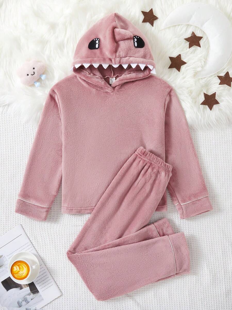 SHEIN Kids Nujoom 2pcs/set Cute Shark Shaped Coral Fleece Warm Pajamas For Tween Girls