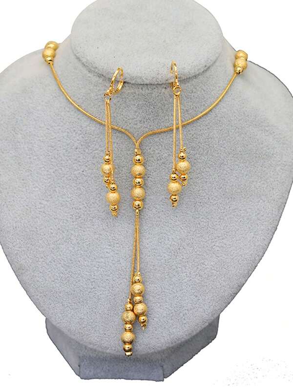 2pcs/set Fashionable Matte & Polished Copper Beaded Mid-length Necklace And Earrings Set, Suitable For Women's Daily Wear, Party Decoration