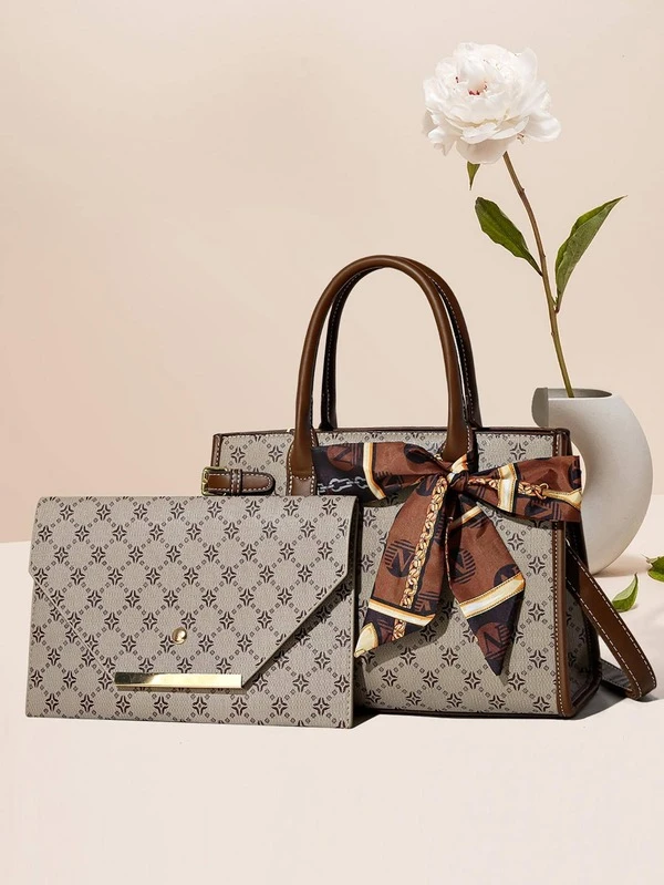 2pcs/set Full Print Fashionable Bow Twilly Scarf Decorated Tote & Clutch Bag