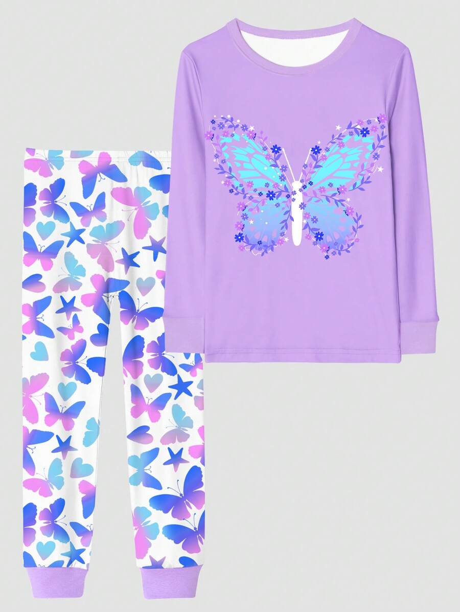Tween Girl 2pcs/Set Purple Butterfly Print Pajama Set For Home Wear