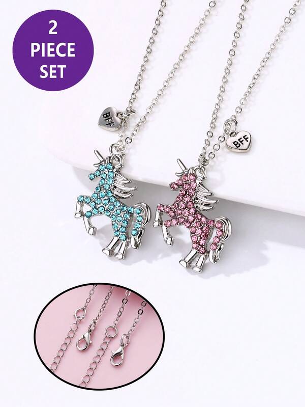 2pcs/set Little Girls' Cute Horse Zinc Alloy, Plastic & Acrylic Gemstone Necklaces In Pink And Blue, Suitable For Daily Wear, Gifts