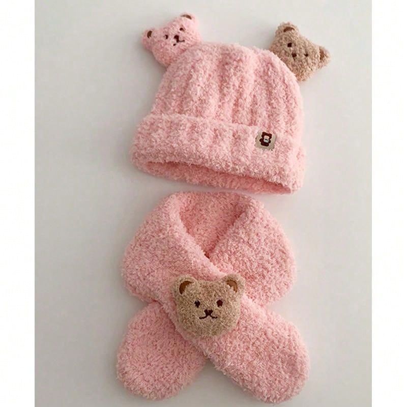 2pcs/set Unisex Baby Bear Hat And Scarf, Windproof & Warm Plush Cap For Kids Outdoor Activities