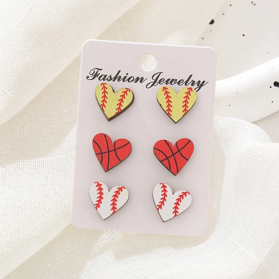 3 Pairs/Set Sports Themed Wooden Stud Earrings, Including Heart, Baseball, Football, Basketball, Volleyball, Random Delivery