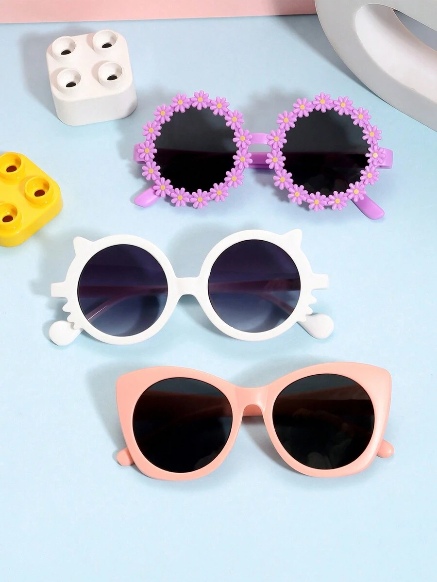 3 Pcs Girls 6-12 Years Round Polycarbonate Cat Eye Daisy Kitten Cartoon Fashion Sunglasses For Daily Use