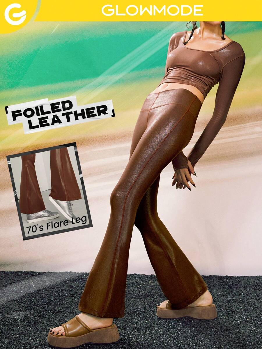 GLOWMODE 31" Foiled Leather Effect V-Shaped Waist Flared Brushed Sports Leggings