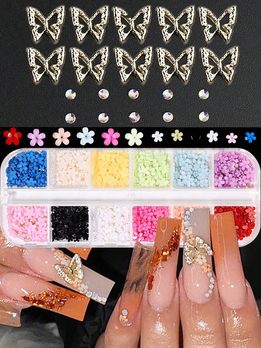 3D Mixed Pink White Small Flower Nail Art Charms Butterfly Shaped Nail Rhinestone Silver Gold Alloy With Gold Silver Beads Kawaii Resin Fashion Cartoon Nail Decorations