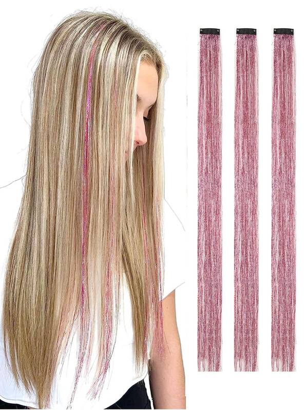 3PCS Clip in Hair Tinsel Kit, Heat Resistant Glitter Tinsel Hair Extension with Clips on, Fairy Hair Sparkle Strands Festival Gift Party Dazzle Hair Accessories for Women Girls Kids
