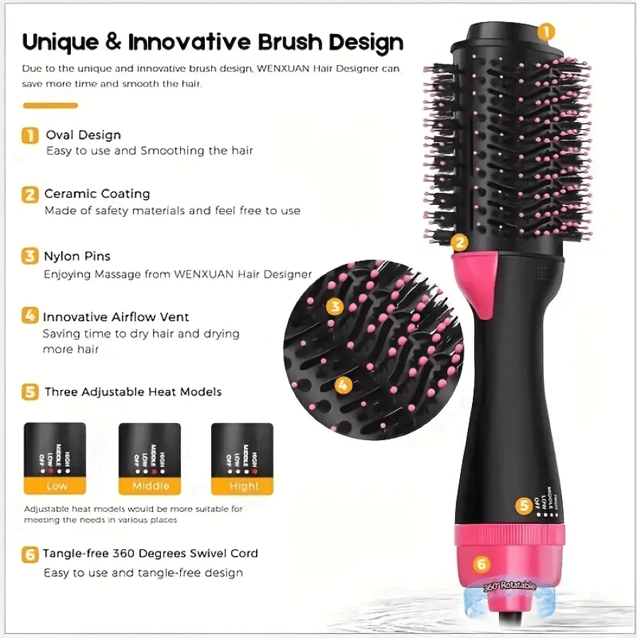 3in1 Hot Air Comb, Curling Iron, Metal Head Hair Dryer Straightener With Multilevel Heating Settings And Indicator Lights