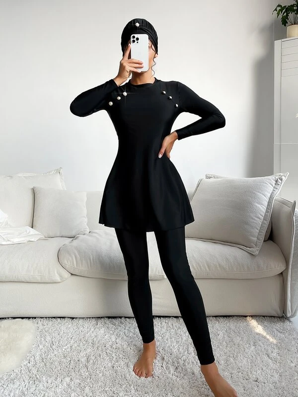 SHEIN Swim Mulvari 3pack Button Detail High Neck Bikini Swimsuit With Hat