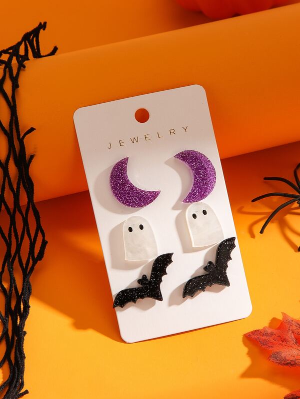 3pairs Halloween Bat & Ghost Design Stud Earrings
