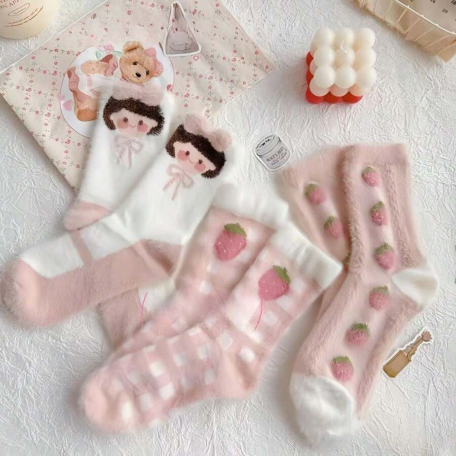3pairs Pink Strawberry Girl Fuzzy, Soft, Comfortable & Warm Mid-Calf Socks
