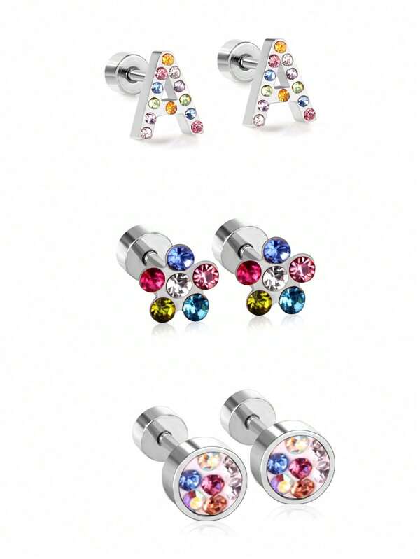 3pairs/Set Inlaid Rhinestone 18k Gold Plated Stainless Steel English Letter A Design Earrings With Six-Color Flower & Cylinder & Screw Back For Couples, Daily & Party & Gift Accessory