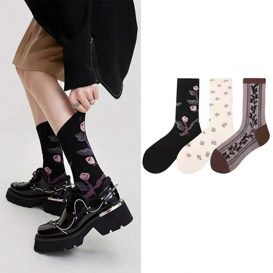 3pairs/Set Women'S Vintage Style Dopamine Printed Over Knee Socks For Autumn/Winter