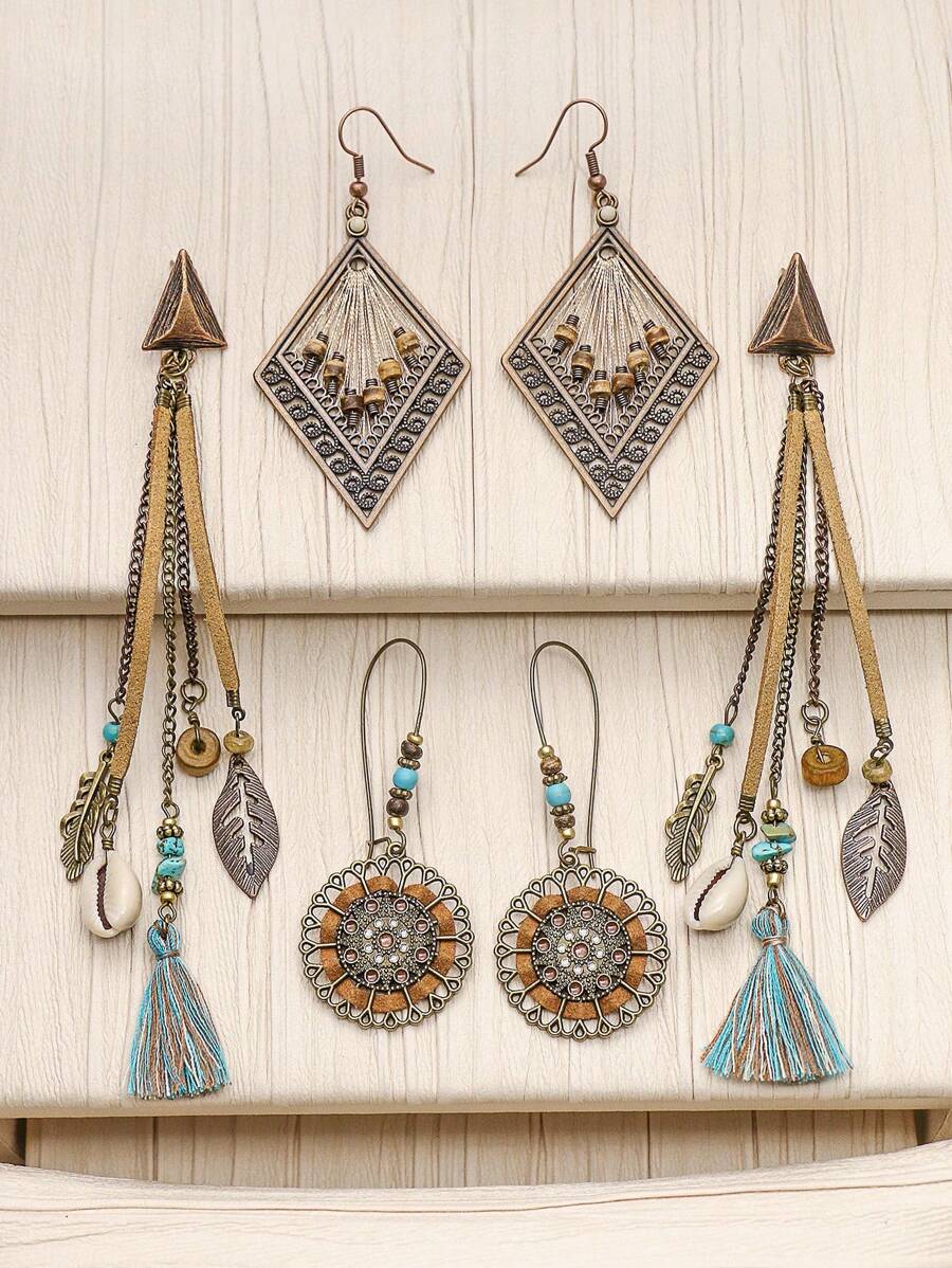 3pairs/set Bohemian & Vintage Style Geometric Shape Alloy Handmade Weaving Tassel Earrings Combination For Women, Suitable For Daily Life, Work, Street Shooting And Photography To Show Unique Temperament