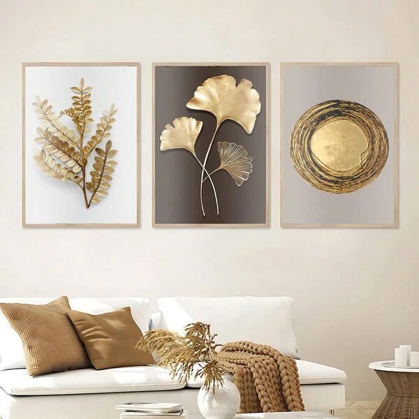 3pcs Nordic Ginkgo And Annual Wheel Canvas Wall Art - Golden Leaf Poster Prints For Home Living Room Decor - NO Frame Included