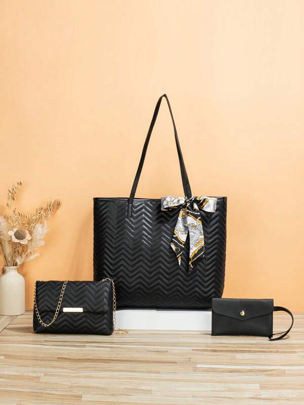 3pcs Bag Set Shoulder Tote Crossbody Bag Purse Wallet PU Chevron Twilly Scarf Decor Fashionable, Best Work Bag For Women