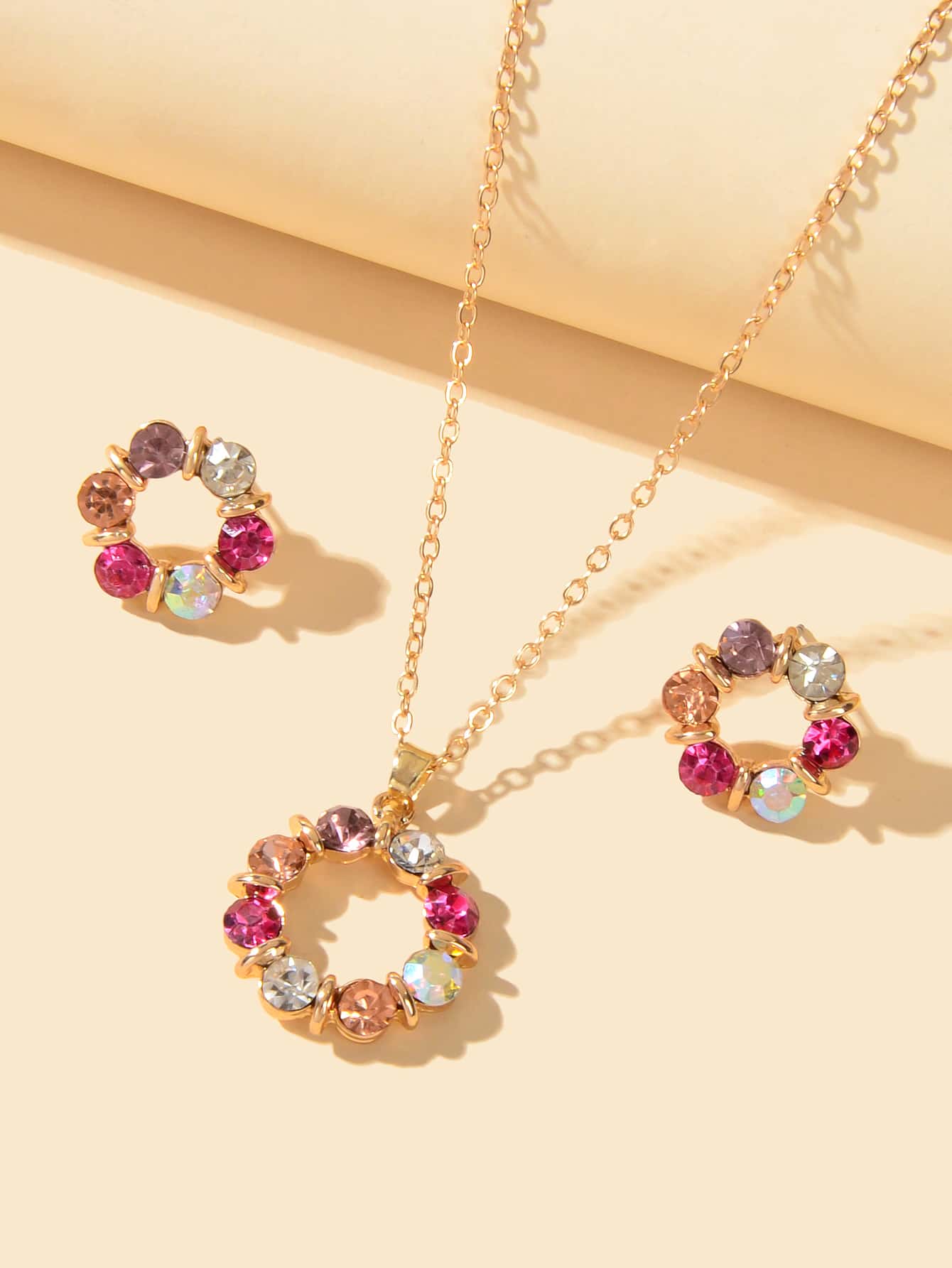 3pcs Exquisite Colorful Cubic Zirconia Circle Flower Pendant Necklace Stud Earrings Wedding Engagement Jewelry set