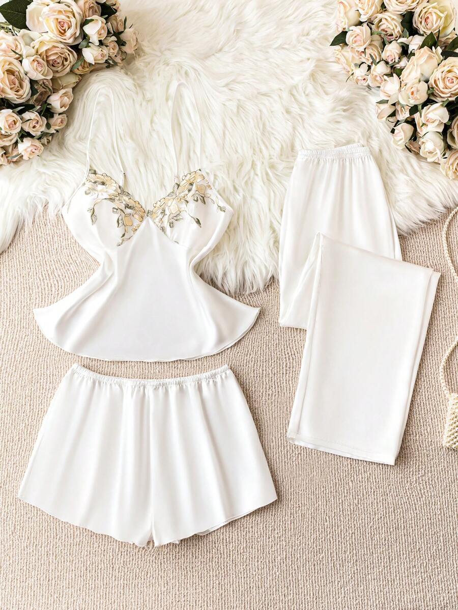 3pcs Floral Embroidery Pajama Set