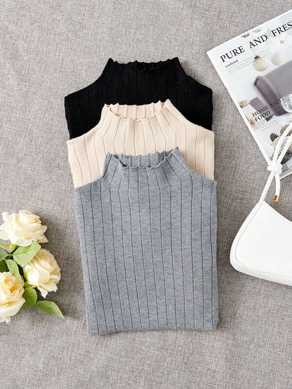 SHEIN Essnce 3pcs Mock Neck Ribbed Knit Lettuce Trimed Sweater
