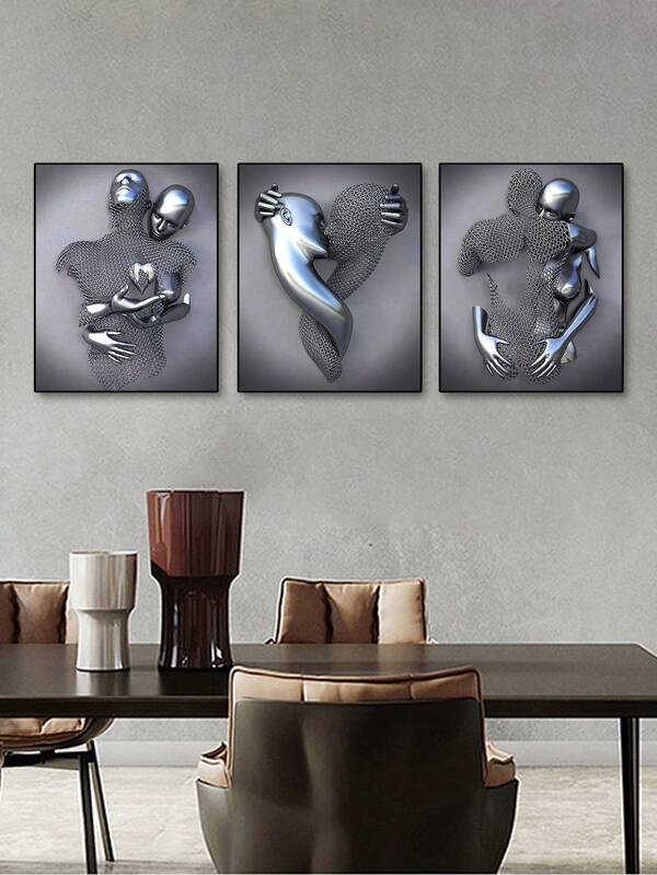 3pcs Modern Simplicity Style Canvas Printed Wall Art Set With Metallic Human Figure Ins Element, Suitable For Living Room And Bedroom, Reusable And Removable