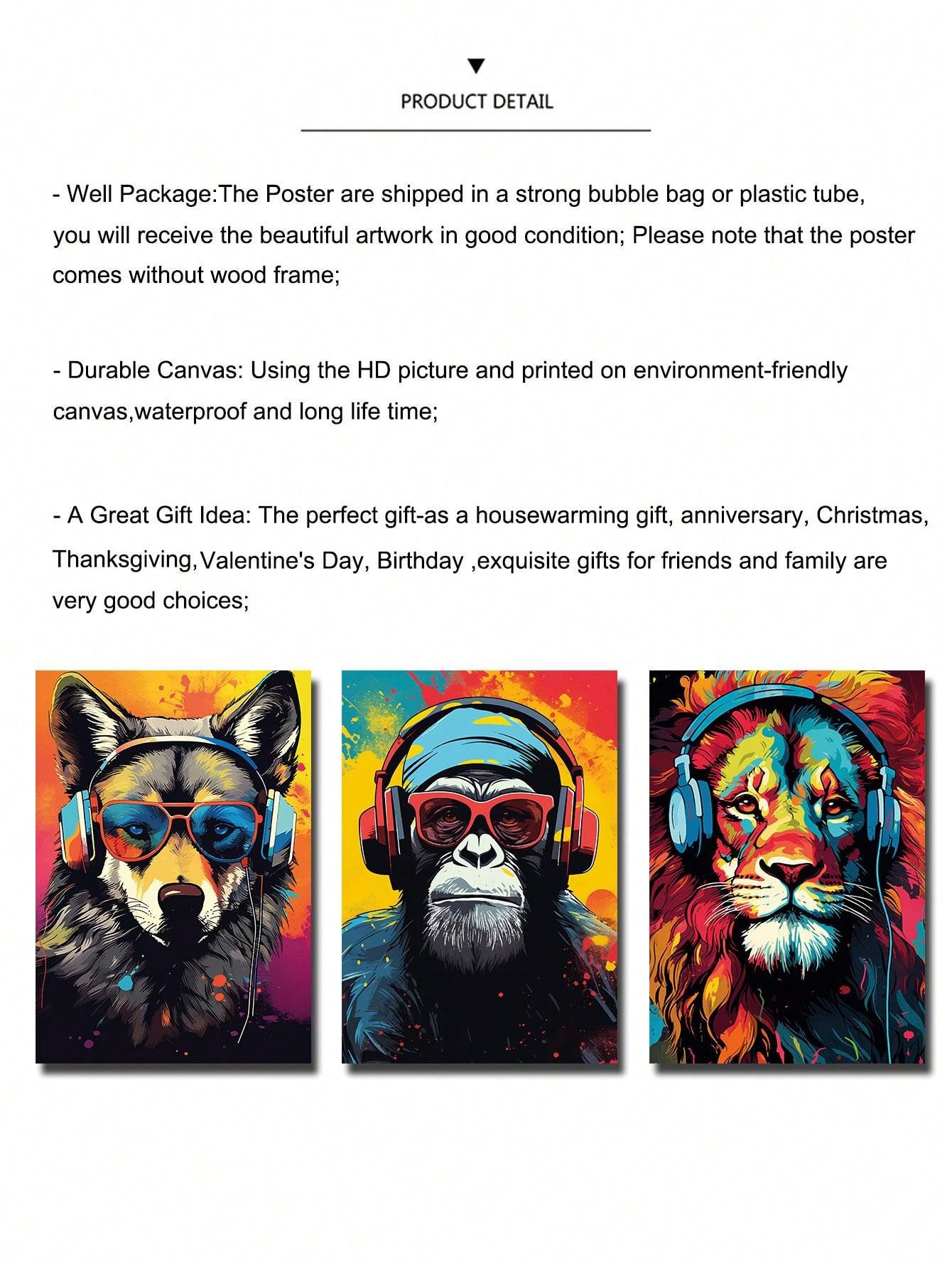3pcs Set Gamer Funny Art Trendy Poster Earphone Animal Tiger Wolf Chimpanzees Gaming Funky Painting Canvas Print Creative Wall Picture for Play Room,Dorm,Bedroom,Teen Room,Home Decoration,No Frame