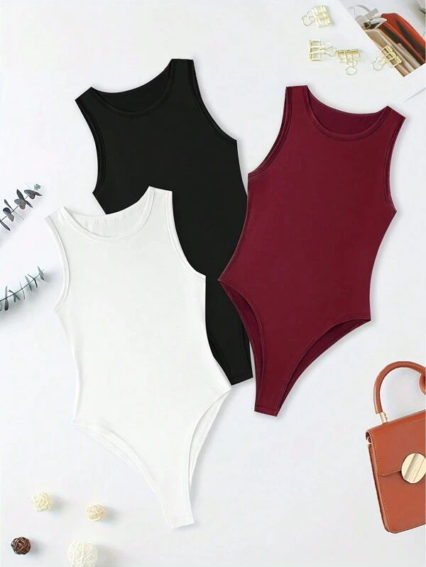 3pcs Solid Color Sleeveless Bodysuit