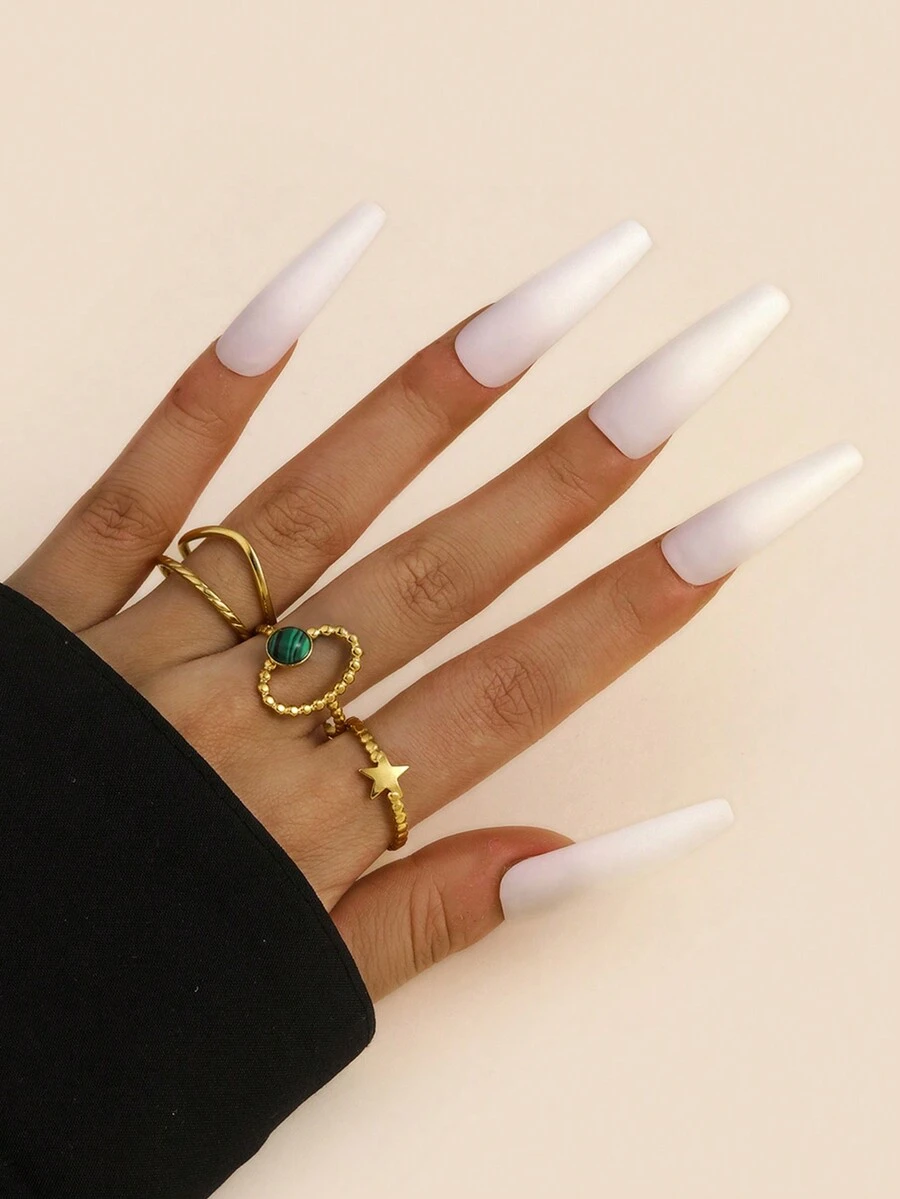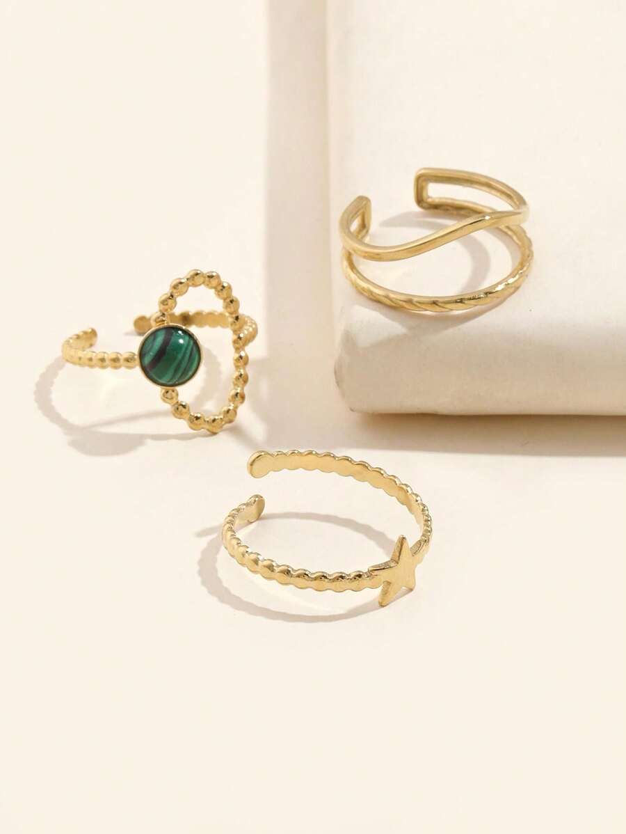 3pcs Stainless Steel Golden Yellow Five-Pointed Star Shape Ring With Turquoise Ring Opening Can Adjust The Size Of The Finger Circumference, Fashionable And Simple Women'S Ring Set, Suitable For Daily Decoration