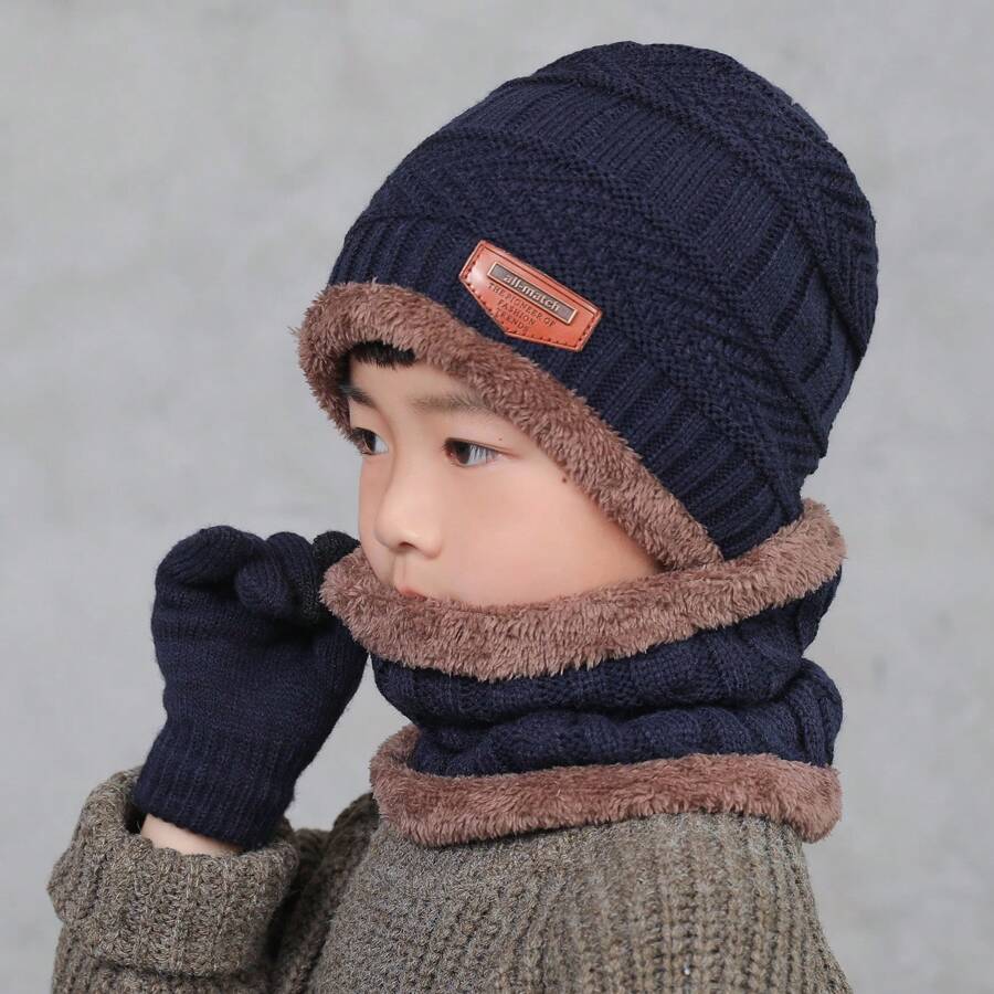 3pcs Winter Warm Knitted Beanie Hat And Scarf Set For Kids Aged 5-14